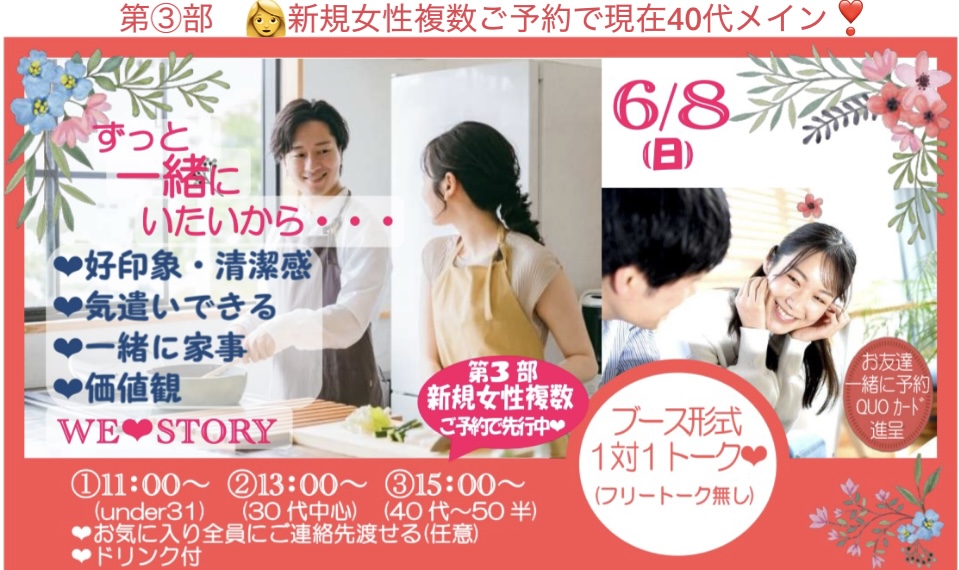 毎回圧倒的お一人参加多数だから一人でも安心☆ブース形式トーク集中できる♪新プロフで早く…